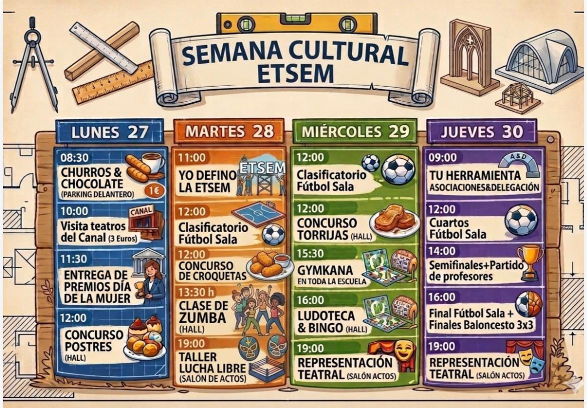Como en cursos anteriores, la Delegación de Alumnos, junto con las distintas asociaciones de la Escuela, celebrará del 27 al 30 de abril una nueva edición de la Semana Cultural, una iniciativa ya consolidada en la vida del centro.